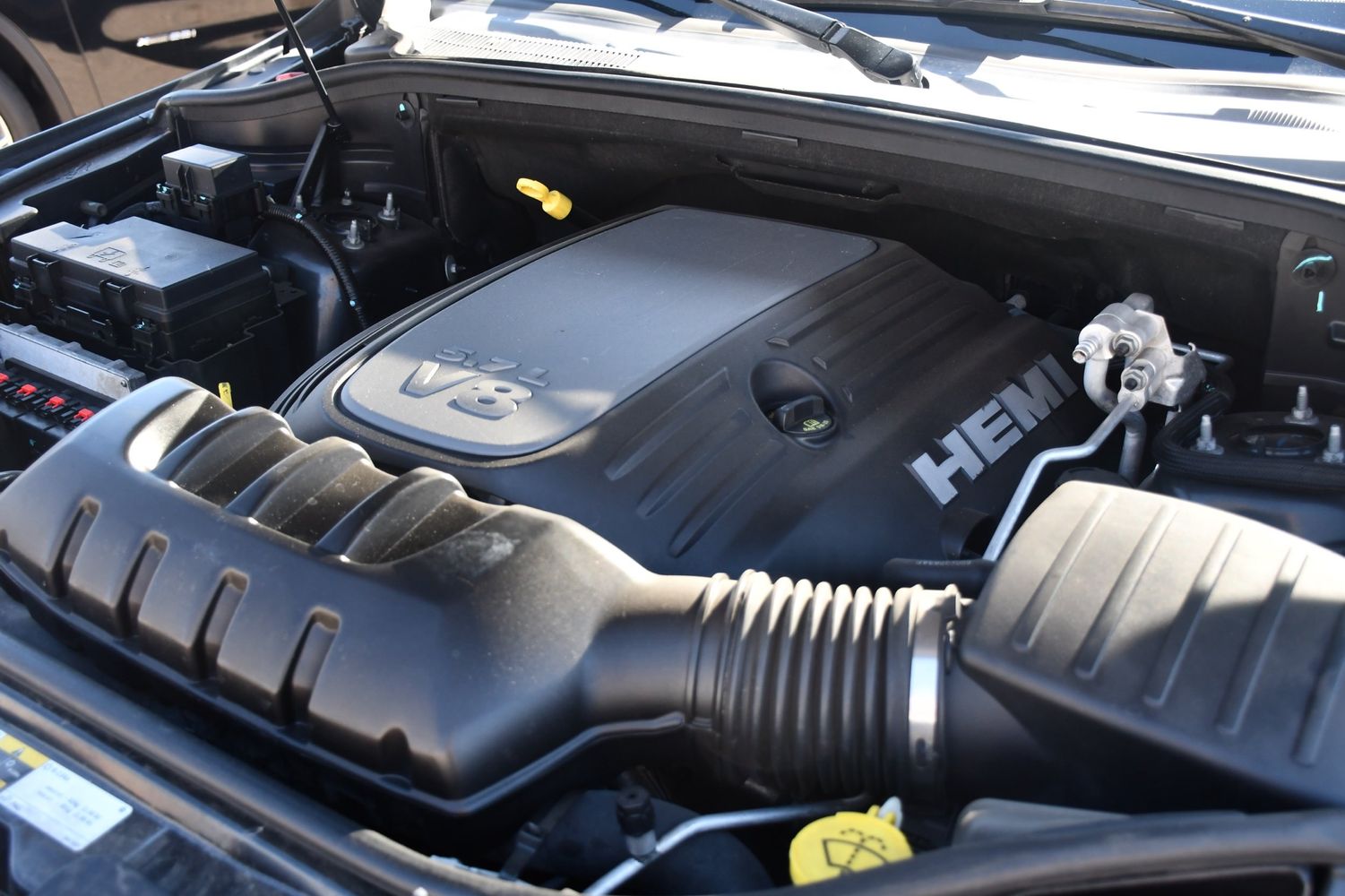 Engine Location: Front mounted engine. Fuel Type: Regular unleaded. Ignition: Spark ignition system. Variable intake manifold: Variable intake manifold. Engine Mounting direction: Longitudinal mounted engine. Engine block material: Iron engine block. Cylinder head material: Aluminum cylinder head. Brake type: 4-wheel disc brakes. ABS Brakes: 4-wheel antilock (ABS) brakes. Tailpipe: Stainless steel dual exhaust with chrome tailpipe finisher. Engine: HEMI 5.7L V-8 variable valve control, regular unleaded, engine with cylinder deactivation and 360HP. Engine Short: HEMI 5.7L V-8. Engine Configuration: HEMI V8. Valves per cylinder: 2. Displacement liters: 5.7 L. Bore: 3.92". Stroke: 3.58". Compression ratio: 10.5. Horsepower: 360 HP @5150 RPM. Governed speed: 5800 RPM. Towing capacity: 7,200 lbs.. Max gross combined weight rating: 13,100 lbs.. Torque: 390 lb.-ft. @ 4250 RPM. Engine Cylinders: 8. Displacement cubic inch: 345 cu.in.. Standard curb weight: 5150 lbs.. Standard payload: 1660 lbs.. Fuel economy fuel type: Regular unleaded. Injection Type: Sequential MPI. Spare tire: Full-size spare tire with steel wheel. Spare tire location: Spare tire mounted under the cargo floor. Fuel economy (city/highway/combined): 13/19/15.2 MPG. Fuel economy city: 13 MPG. Fuel economy combined: 15.2 MPG. Performance quarter mile time: 14.92 seconds. Performance quarter mile speed: 91.1 mph. Greenhouse gas score: 1.00 GG. Air pollution score: 5.00 AP. Fuel economy highway: 19 MPG. Performance acceleration: Estimated (0-60mph): 6.53 seconds. USA - annual tons of CO2: 9.8.
